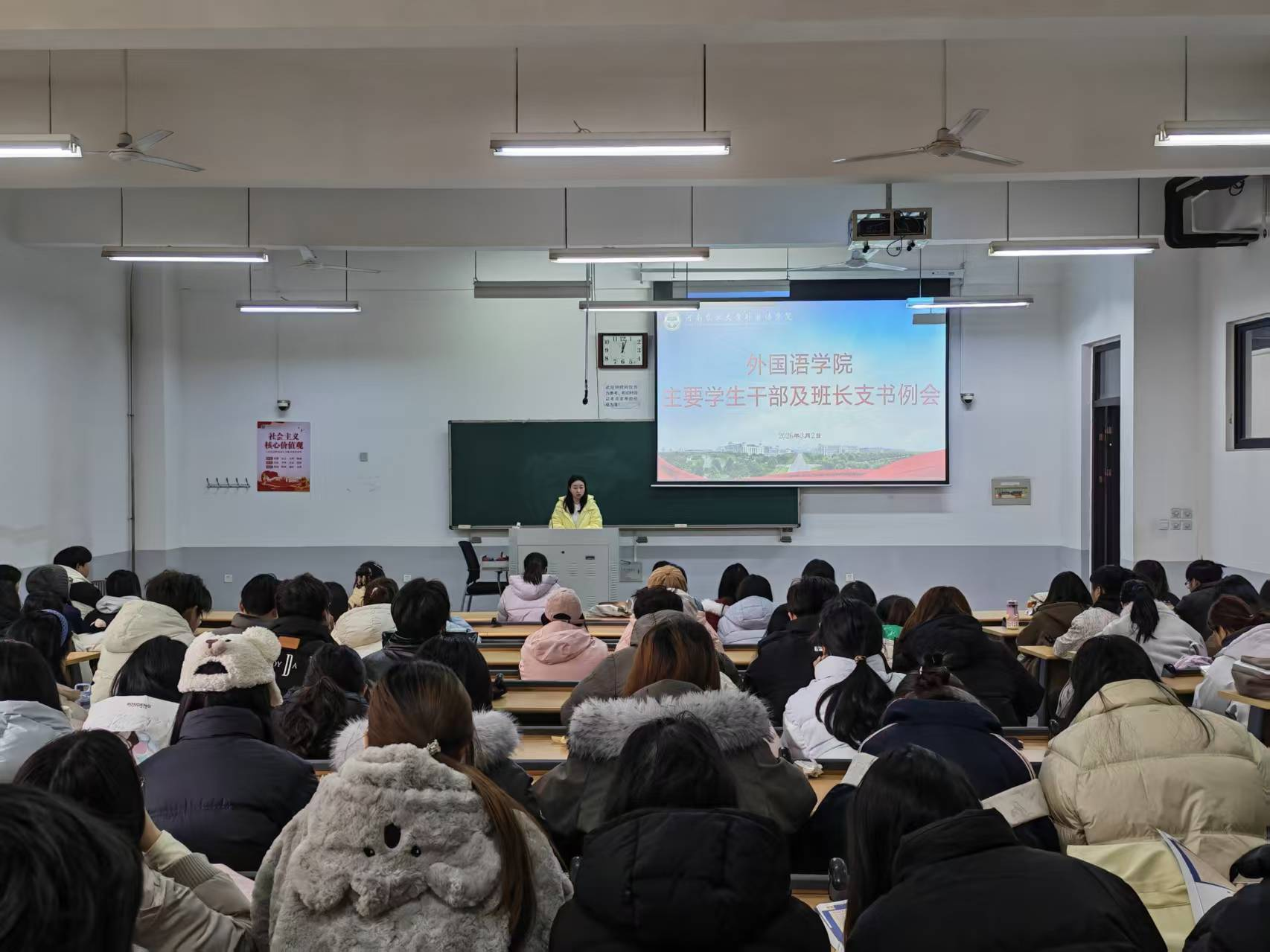 本网讯(审稿:张玥 供稿:侯彦冰 单梦梦)为部署新学期重点工作,进一步强化责任担当,提升学生干部服务意识与履职能力,3月2日中午,我院于繁塔楼D102召开新学期全体学生干部会议,团委书记李晶、副科级组织员侯彦冰、团委副书记武宗励出席会议,23、24级全体学生干部及班长支书参与会议。